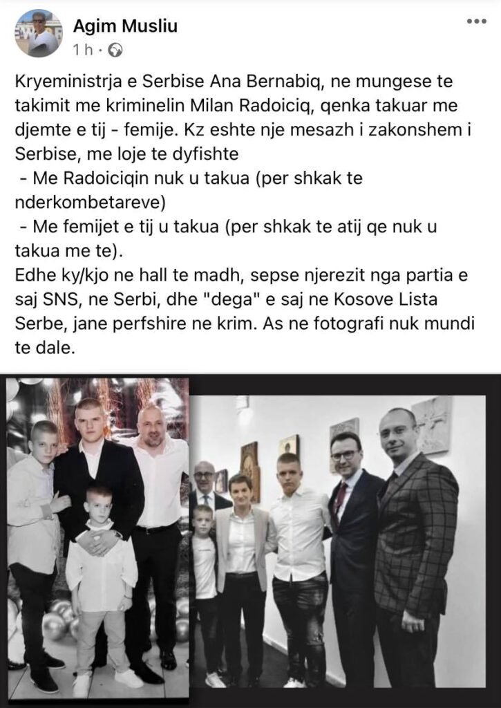 “Kryeministrja e Serbisë, Ana Brnabiq, në mungesë të takimit me kriminelin Milan Radoiçiq, qenka takuar me djemtë e tij – fëmijë. Ky është një mesazh i zakonshëm i Serbisë, me loje të dyfishtë”.