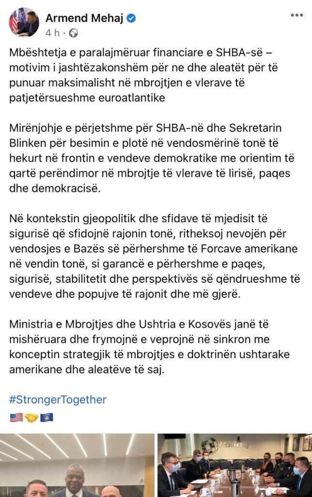 Mirënjohje e përjetshme për SHBA-në dhe Sekretarin Blinken për besimin e plotë në vendosmërinë tonë të hekurt në frontin e vendeve demokratike me orientim të qartë perëndimor në mbrojtje të vlerave të lirisë, paqes dhe demokracisë”, shkruan Mehaj.