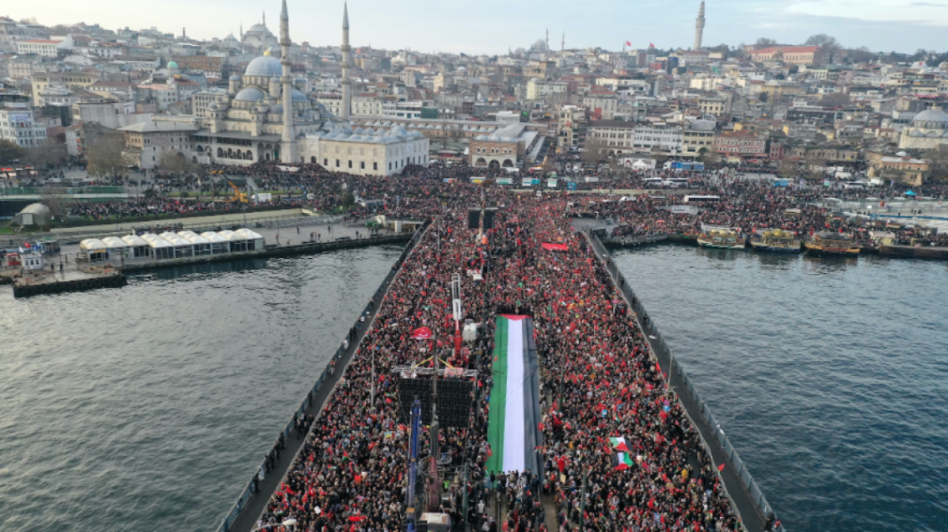Mijëra njerëz janë mbledhur për një ngjarje të titulluar “Mëshirë për dëshmorët tanë, mbështetje për Palestinën, mallkim për Izraelin” në xhamia gjatë lutjeve të mëngjesit për t’iu bashkuar një procesioni të organizuar nga një OJQ e Turqisë.