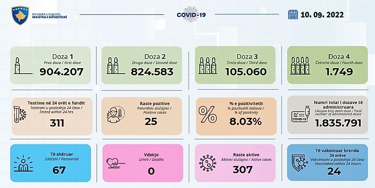 Ministria e Shëndetësisë bën të ditur se në 24 orët e fundit janë shënuar 25 raste të reja me coronavirus në Kosovë, nga 311 testime të bëra.