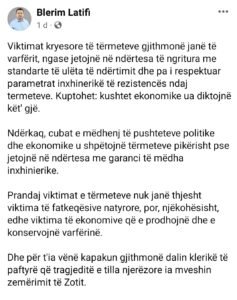 A në ditë fatkeqësie e gjeti profa të bëjë filozofi?! Edhe në mes të Beogradit të kishte rënë tërmeti nuk do t’i kishte shkuar ndokujt ndër mend të bënte filozofi për të shfrytëzuar situatat. Shumë i paske fërkuar duart profesor Latifi. Filozofia në vetvete synon përsosjen e moralit, humanizmin dhe pastrimin e shpirtit. Si mund të jetë filozof i mirë një shpirtlig si ti që as fjalën ngushëllime nuk ta nxë goja, të paktën sa për sy e faqe! Si mund të jetë i moralshëm një njeri që gënjeshtrës nuk i ndahet dot as në ditë fatkeqësie.