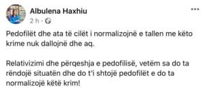 “Relativizimi dhe përqeshja e pedofilisë, vetëm sa do ta rëndojë situatën dhe do t’i shtojë pedofilët e do ta normalizojë këtë krim!”, ka shkruar ajo në Facebook.