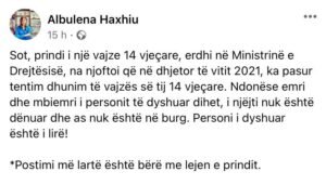 Pak orë para këtij statusi, ministrja Haxhiu kishte njoftuar përmes llogarisë së saj në Facebook se një qytetar ka shkuar në Ministrinë e Drejtësisë për t’u ankuar se si vajza e saj 14-vjeçare është tentuar të dhunohet vitin e kaluar nga një person i cili ende gjendet në liri.