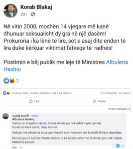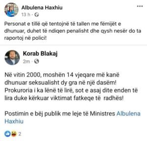 “Në vitin 2000, në moshën 14-vjeçare më kanë dhunuar seksualisht dy gra në një dasëm. Prokuroria i ka lënë të lira, sot e asaj dite enden duke kërkuar viktimat fatkeqe të radhës. Postimin e bëj publik me leje të ministres Albulena Haxhiu”, ishte postimi i Blakajt.